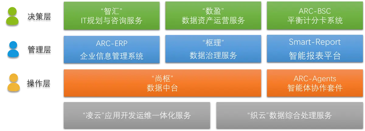 決策層,“智匯”IT規(guī)劃與咨詢服務(wù),憑借專業(yè)團(tuán)隊(duì)對(duì)行業(yè)趨勢(shì)和技術(shù)生態(tài)的深度洞察,為企業(yè)量身定制契合發(fā)展戰(zhàn)略的IT架構(gòu)藍(lán)圖,明晰數(shù)字化路徑;“數(shù)盈”數(shù)據(jù)資產(chǎn)運(yùn)營(yíng)服務(wù),挖掘企業(yè)數(shù)據(jù)價(jià)值,將分散數(shù)據(jù)轉(zhuǎn)化為可運(yùn)營(yíng)、能創(chuàng)造效益的資產(chǎn),驅(qū)動(dòng)業(yè)務(wù)創(chuàng)新;ARC - BSC平衡計(jì)分卡系統(tǒng),以戰(zhàn)略為導(dǎo)向,從財(cái)務(wù)、客戶、內(nèi)部流程、學(xué)習(xí)與成長(zhǎng)等維度,量化指標(biāo)、監(jiān)控進(jìn)度,助力科學(xué)決策 。