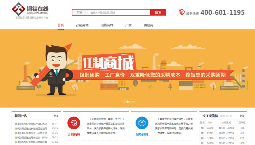 銅鋁在線為有色金屬行業(yè)的電子商務(wù)交易平臺,采用系統(tǒng)自動組批團購的方式,將需求相同的客戶組批給統(tǒng)一廠家競價,以組團形式在降低買家采購成本的同時降低工廠的生產(chǎn)成本。平臺同時提供現(xiàn)貨采購模式,供用戶實現(xiàn)快速線上交易。
