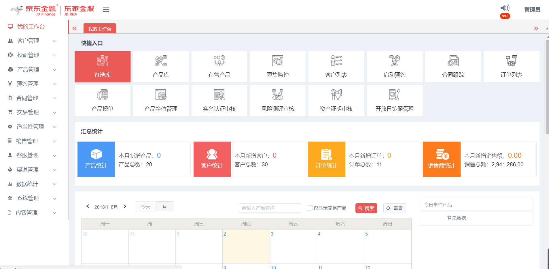 • 我的工作臺:提供系統(tǒng)菜單快捷入口,統(tǒng)計(jì)核心業(yè)務(wù)數(shù)據(jù)及開放期內(nèi)的產(chǎn)品日歷事件展示